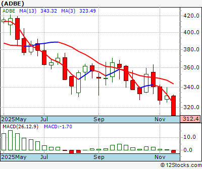 ADBE Score = 0 and is and last price = 312.40 ADBE: Overiding monthly trend down. Intermediate weekly trend down. Short term daily trend down.