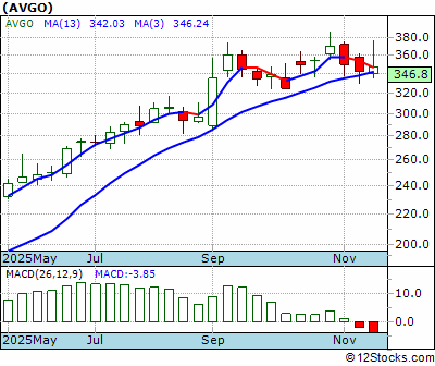 AVGO Score = 70 and is and last price = 346.82 AVGO: Overiding monthly trend getting little worse. Intermediate weekly trend down but maybe still not diving. Short term daily trend up and very good.