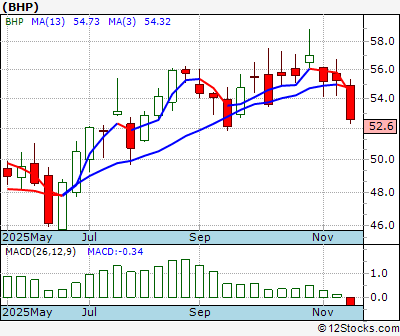 BHP Score = 0 and is and last price = 52.58 BHP: Overiding monthly trend down. Intermediate weekly trend down but maybe getting better. Short term daily trend down.