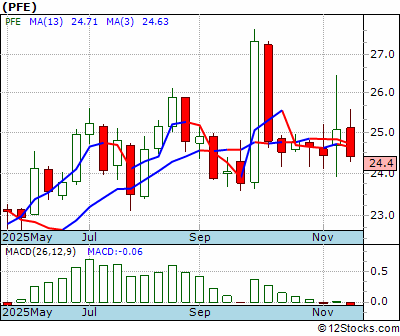 PFE Score = 10 and is and last price = 24.40 PFE: Overiding monthly trend down. Intermediate weekly trend down but maybe still not diving. Short term daily trend down.
