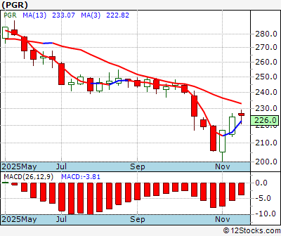 PGR Score = 40 and is and last price = 226.00 PGR: Overiding monthly trend down. Intermediate weekly trend up and very good. Short term daily trend just ok but getting worse.