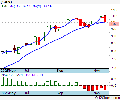 SAN Score = 20 and is and last price = 10.06 SAN: Overiding monthly trend getting little worse. Intermediate weekly trend down. Short term daily trend down.