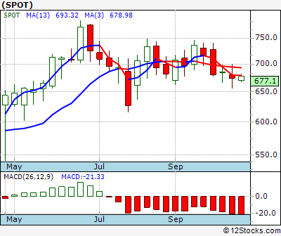 SPOT Score = 0 and is and last price = 589.23 SPOT: Overiding monthly trend down. Intermediate weekly trend down. Short term daily trend down.