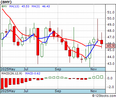 BMY Score = 30 and is and last price = 45.94 BMY: Overiding monthly trend getting better. Intermediate weekly trend down but maybe getting better. Short term daily trend down.