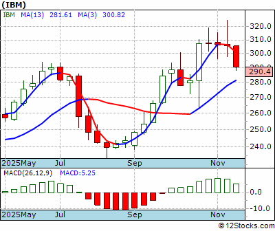 IBM Score = 40 and is and last price = 290.40 IBM: Overiding monthly trend getting little worse. Intermediate weekly trend down but maybe getting better. Short term daily trend down but maybe still not diving.
