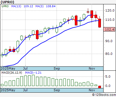 UPRO Score = 10 and is and last price = 102.38 UPRO: Overiding monthly trend getting little worse. Intermediate weekly trend down. Short term daily trend down.