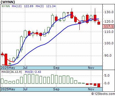 WYNN Score = 0 and is and last price = 117.14 WYNN: Overiding monthly trend down. Intermediate weekly trend down. Short term daily trend down.