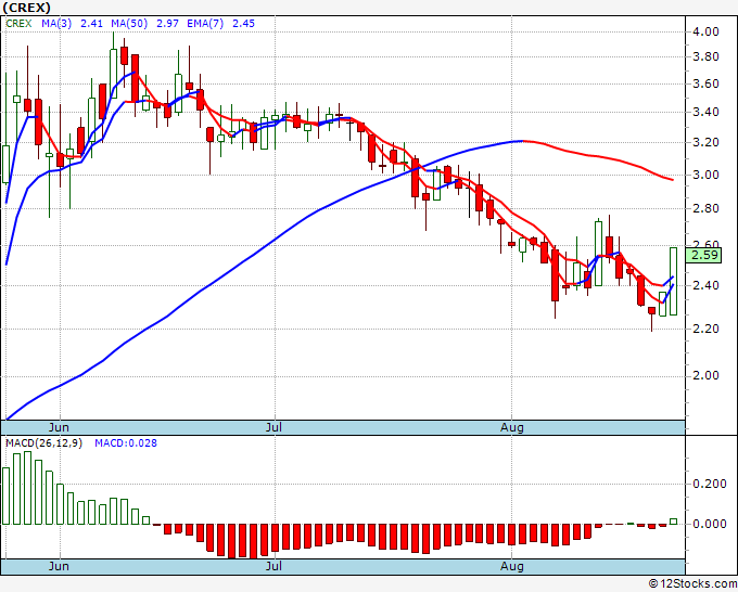 The overall 12Stocks.com Smart Investing & Trading Score is 40 (measures stock trend from 0-bearish to 100-bullish) which puts CREX in short term bearish to neutral trend.