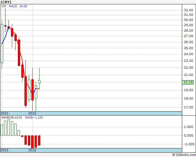 The overall 12Stocks.com Smart Investing & Trading Score is 20 (measures stock trend from 0-bearish to 100-bullish) which puts CRY in short term bearish trend.